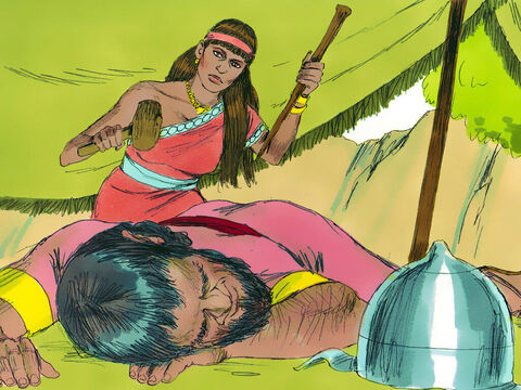 Sisera, die Kanaänitiese bevelvoerder, het ook gevlug. Hy het na ’n tent toe gevlug om weg te kruip. Daar het Jael, die vrou van Geber, vir Sisera toe hy geslaap het, met ’n tentpen en hamer doodgemaak, deur die tentpen in sy kop te slaan tot in die grond.