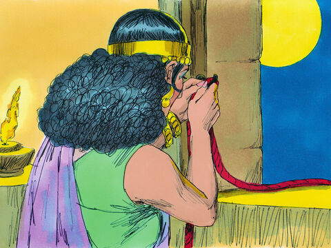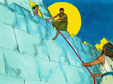 Sy het hulle daarna met ’n tou laat afsak deur die venster, want haar huis was binne die stadsmuur en die verspieders het vir drie dae gaan wegkruip in die bergland. Hulle het ook vir haar gesê dat sy ’n karmosynrooi gevlegte tou moet vasmaak aan die venster waardeur sy hulle vrygelaat het, wanneer Jerigo aangeval word. Sy en haar hele familie moes in haar huis wees. Dan sou haar en haar familie se lewens gespaar word.