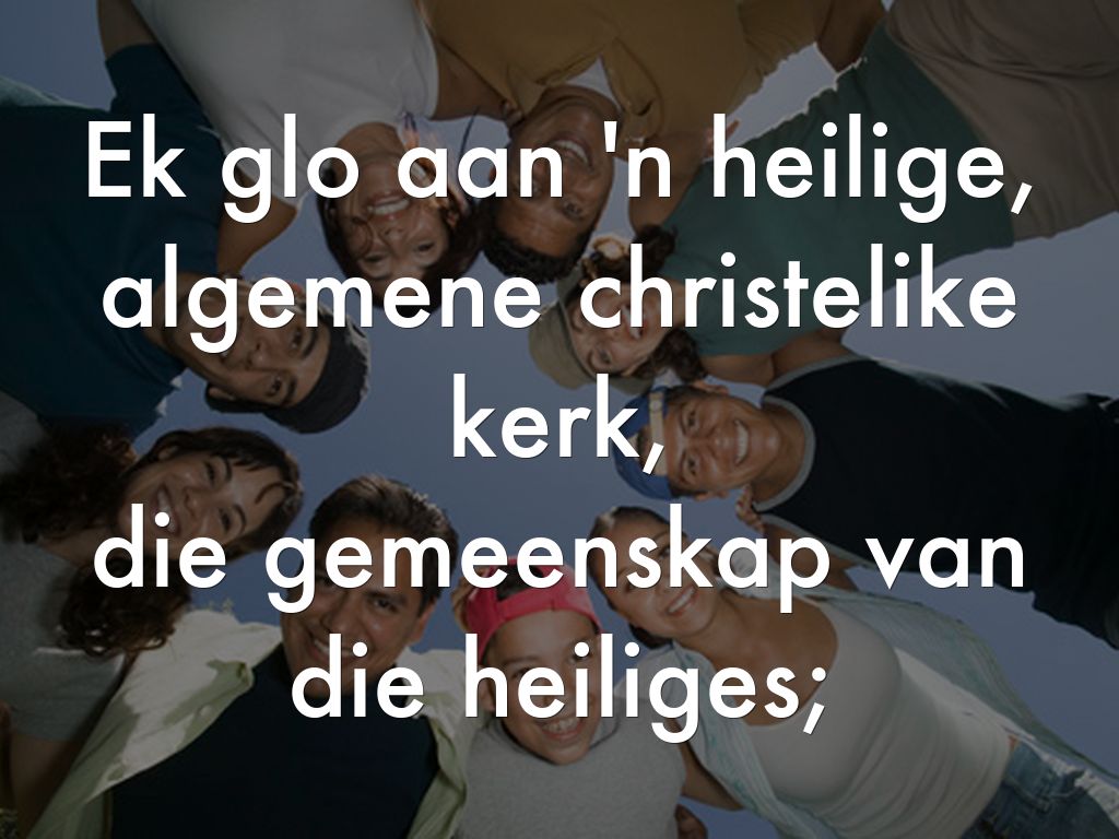 Aan die kruis was dit nie nodig, dat ons bloed hoef te vloei nie. Jesus Christus se bloed het gevloei in ons plek. Deur Sy bloed het Hy ons bloedbroers en bloedsusters van mekaar gemaak. Ons het ’n geestelike familie geword. Daarom glo ons in EEN HEILIGE ALGEMENE CHRISTELIKE KERK.