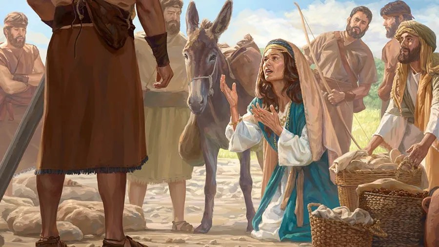 Toe Abigajil vir Dawid tegemoet gaan, het sy van haar donkie afgeklim en voor Dawid se voete neergeval en by Dawid gepleit om asseblief afstand te doen van sy voorneme om Nabal en sy manne dood te maak. Sy het as’t ware verantwoordelikheid aanvaar vir haar man Nabal se dwaasheid en gesmeek om hulle lewens te spaar. Sy het toe al die kos voor Dawid gesit, sodat hulle kon eet. Sy het ook die lof en voorspoed van Dawid besing.
