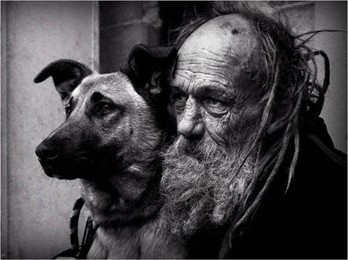 Dan steek hy sowat 100 meter van my vas. Hy gaan sit op die kerk se muurtjie. Hy haal opgefrommelde plastieksakke uit sy “baadjie” se sakke. Ook ’n bottel met water. Dan sien ek die hond naderkom. Net so stadig. Die ou man neem ’n stuk plastiek en vryf dit glad oop en sit dit op die grond neer. Dan gooi hy daar water op sodat die hond kan drink. Bietjie vir bietjie. Toe neem hy self ’n sluk of twee. Hy maak nog ’n sak oop en haal iets wat lyk soos ’n stuk brood uit. Hy vryf dit skoon teen sy vuil klere. Toe breek hy ’n stukkie af en gee vir die hond; dié eet graag. Daarna hap hy ook en hulle eet en drink saam.