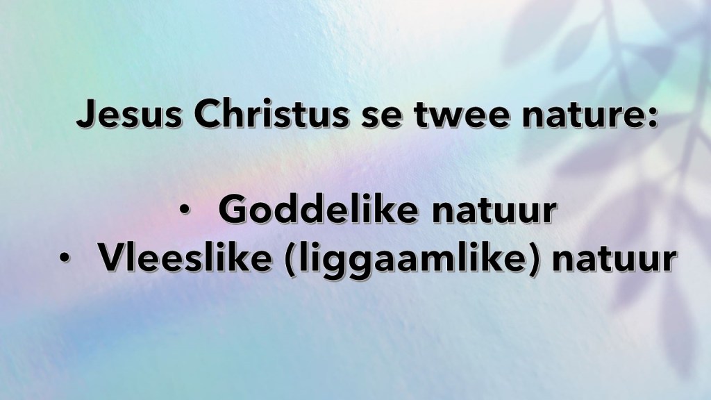 Kom ek verduidelik dit so aan u. Ons glo aan die twee nature van Christus, naamlik Sy Goddelike natuur en Sy liggaamlike natuur. Met Kersfees het Christus, wat Goddelik is, kom mens word. Met Sy Hemelvaart het Sy liggaamlike persoon opgevaar om te sit aan die regterhand van God. In Sy Goddelike natuur is hy egter nog steeds by ons, al is dit onsigbaar. Dit is natuurlik bevrydend. As Jesus net in Sy liggaam by ons was, was dit beperkend. Hy sou hoogstens by ’n paar mense op ’n slag op een plek kon gewees het. Hy sou dan met ander woorde net in Johannesburg kon wees en nie ook by ons hier op Adelaide of Fort Beaufort nie. Die feit dat Hy in sy Godheid by ons is, het die troos dat Hy altyd in alle omstandighede by almal gelyktydig kan wees. Hy kan tegelykertyd in Adelaide, Fort Beaufort, Johannesburg, Washington, Moskou en op enige plek in die wêreld wees.
