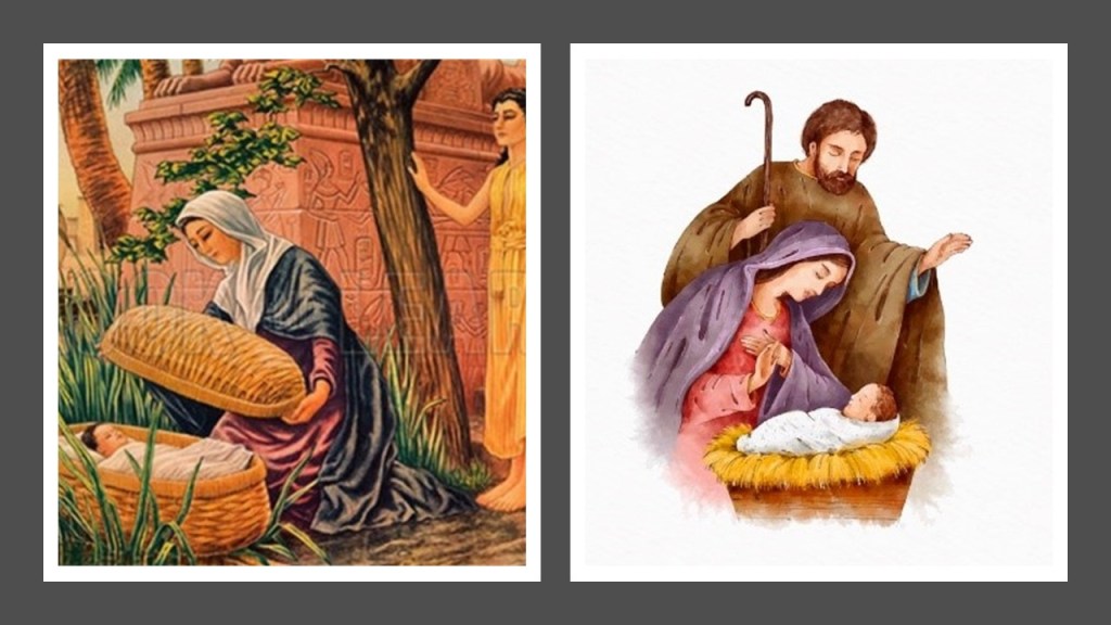 Die geboorte van Jesus Christus is ’n parallel van die geboorte van Moses. Ook vir Hom sou daar nie plek wees nie en Hy is in ’n stal in ’n diere-krip in Betlehem geplaas na sy geboorte. In Moses se tyd was die Farao en die Egiptenare die bedreiging wat alle seuntjies wou doodmaak. In Jesus Christus se tyd het Herodus en die Romeinse Ryk regeer. Herodus die Grote het ook opdrag gegee dat alle seuntjies van twee jaar en onder in Betlehem se distrik doodgemaak moes word. Daarom het Josef en Maria volgens die engel se instruksies na Egipte gevlug en daar geskuil tot Herodus die Grote dood is.