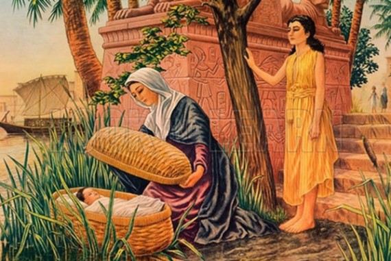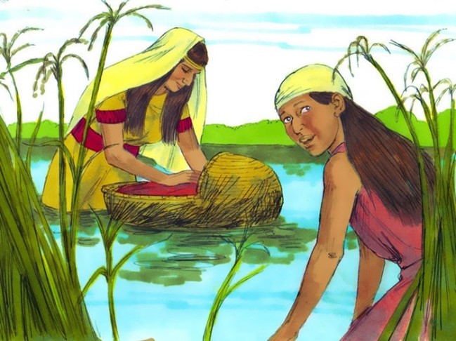 Dan lees ons in Eksodes 2 van ’n man uit die stam Levi wat met ’n Levitiese meisie getrou het. Sy het ’n seuntjie in die wêreld gebring en hom vir drie maande versteek. Toe sy hom nie langer kon versteek nie, het sy ’n biesiemandjie gekry en dit met pik waterdig gemaak. Sy het hom in die mandjie tussen die riete van die Nyl weggesteek, terwyl sy suster ’n oog gehou het. Dan lees ons hoedat een van die dogters van Farao afgegaan het om te swem in die Nyl. Sy het die mandjie tussen die riete gesien en haar slavinne gestuur om te gaan kyk. Toe die Egiptiese prinses sien dit is ’n Joodse seuntjie, het sy hom jammer gekry en besluit om hom aan te neem as haar eie seun. Die seuntjie se suster gaan toe na die dogter van die Farao en vra haar of sy ’n Hebreeuse moeder kon roep om die kind te laat drink totdat hy gespeen is.