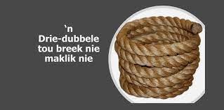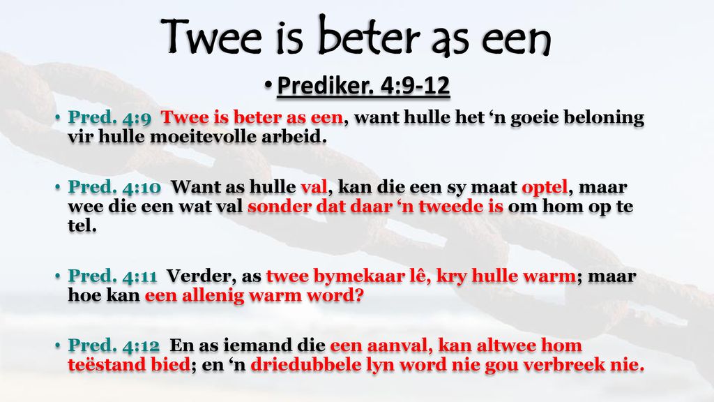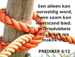 Prediker 4: 9 – 12 beskryf dit duidelik: Twee is beter as een, omdat daar vir hulle ’n ruim beloning is vir hulle inspanning. Ja, as hulle val, kan die een sy maat ophelp; maar wee die een wat val sonder dat daar ’n tweede is om hom op te help! Ook as twee by mekaar lê, kry hulle warm; maar as daar net een is, hoe kan hy warm word? As iemand die een wil oorweldig – twee kan teen hom standhou. ’n Driedubbele koord word nie maklik gebreek nie.