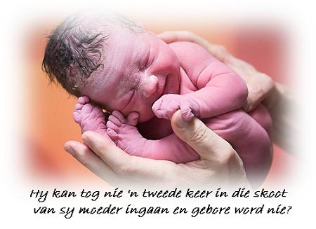 Ons is die nuwe geestelike baba en ons word uit God gebore, met die Heilige Gees as die vroedvrou wat die geboorte laat plaasvind. Sonder die wedergeboorte, die tweede geboorte of die een van bo, kan geen mens God sien nie.
