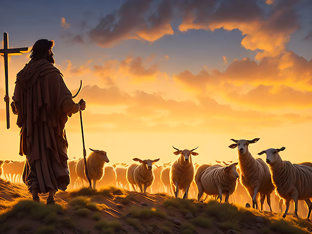 Hy is die Herder wat saam met Sy skape loop in die nag en in die dag, in die koue en in die reën. Hy tel die swak en sieklike lammetjies op Sy skouers en dra hulle na veiligheid. In Sy hand het Hy ’n staf om die wilde diere weg te keer en die wat afgedwaal het terug te bring. In die nag slaap Hy voor die hek van die klipkraal om Sy skape op te pas. Die Here sê mos dat Hy die Weg en die Waarheid en die Lewe is.
