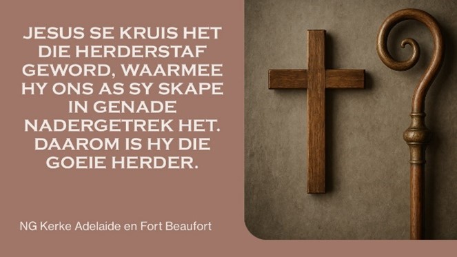 Toe hulle hom op die Heilige Donderdagaand gearresteer het, het Hy nie horings gekry nie. Hy het Petrus opdrag gegee om sy swaard in sy skede te bêre. Toe Hy weerloos voor Pilatus en Herodus gestaan het, het Hy nie horings gekry nie. Toe Hy weerloos aan die kruis gehang het, het Hy nie horings gekry nie. Nee, Hy het gesmeek: “Vader, vergeef hulle want hulle weet nie wat hulle doen nie.” Hy was weerloos aan die kruis. Die Herder het soos een van Sy skape geword. Hy het die Lam van God geword wat die sonde van die wêreld weggeneem het. Sy kruis het die herderstaf geword waarmee Hy ons as Sy skape in genade nadergetrek het.