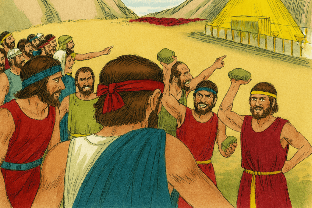Na 40 dae het hulle teruggekom en vertel dat die land uiters vrugbaar is en het selfs van die vrugte van die land gewys. Dit was inderdaad ’n land van melk en heuning. Maar, het die meerderheid verspieders gesê, die land se inwoners is baie groot en sterk en hulle stede is versterk en groot. Hulle het ook die reuse gesien, wat nasate van Enak was. Die meerderheid verspieders het gesê dit is onmoontlik om die land Kanaän in besit te neem. Hulle het gevoel soos sprinkane teen die reuse van daardie land en so was hulle ook in die oë van die Kanaäniete.